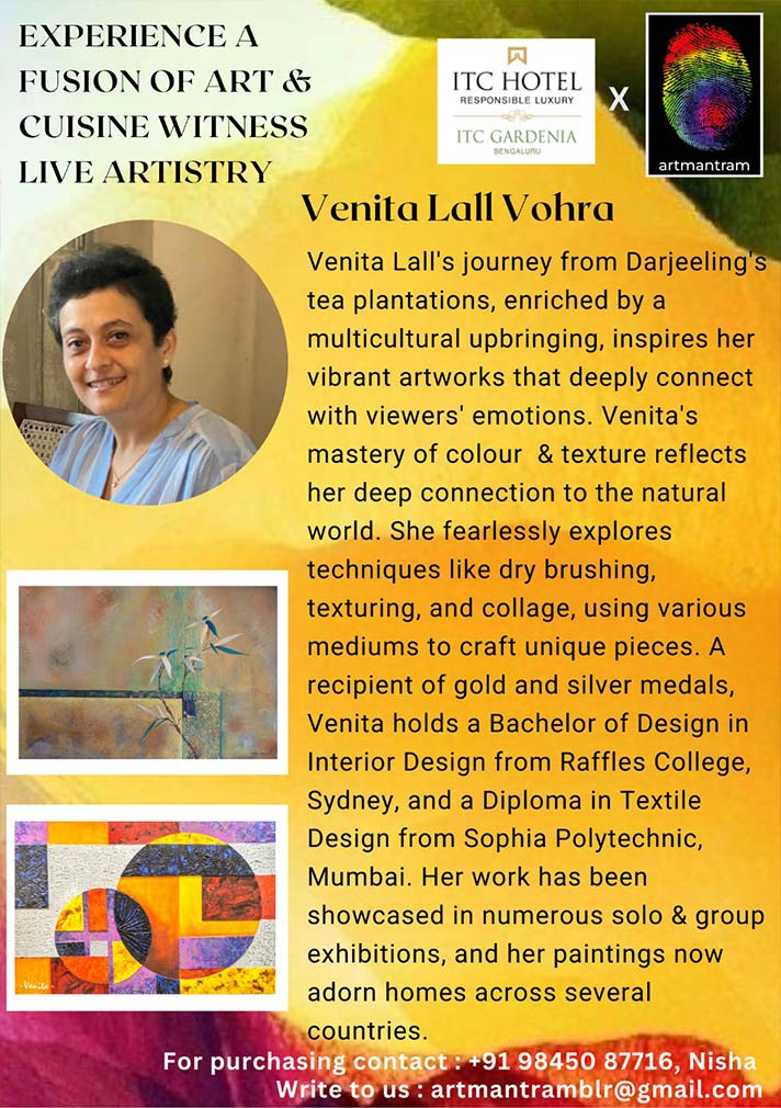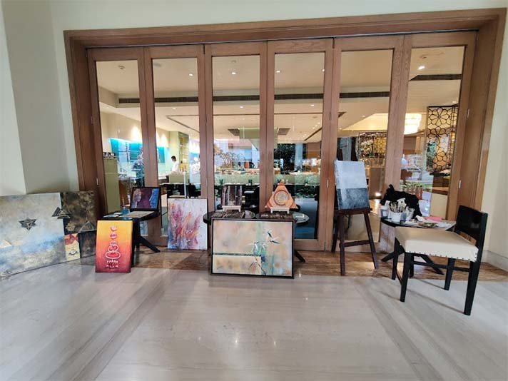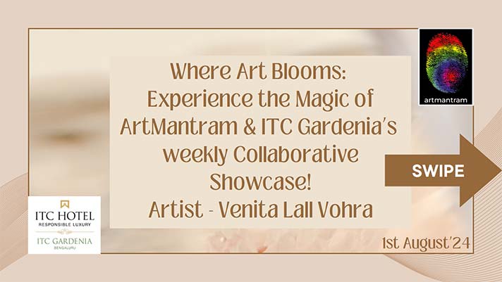 On August 1, 2024, at the elegant ITC Gardenia, I had the honour of being featured in Artmantram's Where Art Blooms series—a beautiful collaboration of art and atmosphere. Sharing my vibrant, evocative pieces with an engaged audience was a joy, as I opened a window into my creative journey and the emotions that fuel my work. Painting live allowed me to connect with fellow art lovers, revealing the techniques and styles that shape my vision.
